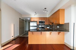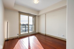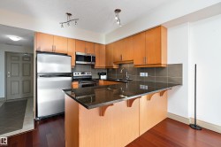 Welcome to Alta Vista South! This bright 10th-floor condo offers open-concept living in a walkable central Edmonton location. The kitchen features maple cabinetry, granite countertops, tile backsplash, stainless steel appliances and a large peninsula with bar seating, flowing seamlessly into the spacious living area with hardwood floors and oversized windows. Step out to your private balcony and enjoy sweeping skyline views. The primary bedroom is generously sized with great closet space and access to a full bath with granite vanity and tiled tub/shower. A convenient powder room near the entry is ideal for guests, and in-suite laundry adds everyday practicality. Residents enjoy a welcoming lobby, fitness room, resident lounge with fireplace and social/party space. Just steps to cafes, restaurants, shops, transit and minutes to Downtown and the River Valley trails—ideal for professionals, students or investors seeking low-maintenance urban living.