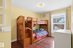 Welcome home to this charming bungalow townhome, perfect for first-time buyer or investors looking to expand their portfolio. Offering affordable condo fees, central air conditioning, a fenced yard, and a partially finished basement, this home blends comfort and value. The main floor features a bright, spacious living room with hardwood flooring, a cozy corner gas fireplace, and sliding glass doors leading to the private rear yard. The dining area sits just off the living room and flows into a functional kitchen with ample cabinet space. Three bedrooms and a 4-piece bath complete the main level. The basement adds excellent flexibility with a fourth bedroom, another 4-piece bathroom, and a welcoming family room ideal for movie nights or game time. Situated in a well-established neighborhood close to transit and amenities, this warm, inviting home offers a wonderful opportunity to move in and make it your own.