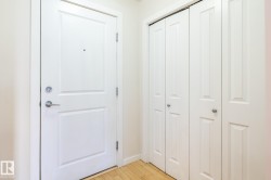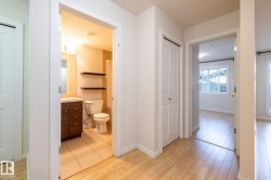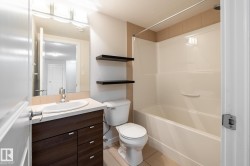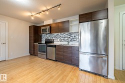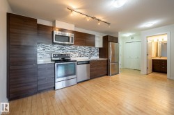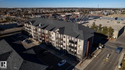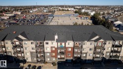 Perfectly situated just steps from grocery stores, coffee shops, restaurants, schools, and public transit—with quick access to the Henday—this main floor unit offers the ultimate in everyday convenience. Inside, you’ll love the open concept layout that fills with natural light from large windows, creating a bright and inviting atmosphere. The kitchen features sleek quartz countertops, rich espresso cabinetry, upgraded backsplash and stainless steel appliances, flowing seamlessly into a spacious dining and living area—perfect for entertaining or relaxing. The primary bedroom boasts a generous walk-through closet leading to a stylish 4-piece ensuite with a tub and shower combo. A second bedroom sits privately across from the ensuite, ideal for guests or an office. Completing this beautiful home are in-suite laundry, an additional 4-piece bath, 1 titled underground parking stall, and a private balcony with a gas line—perfect for BBQs and enjoying fresh air right at ground level. Don't miss out!