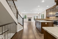 Welcome to McKernan! This beautifully built 3-bedroom, 2-storey half duplex offers over 1,830 sq. ft. of elegant living space steps from the University of Alberta. Thoughtfully designed and energy efficient, the exterior walls are foam-insulated, plus 1" rigid foam exterior insulation for the acrylic stucco R40 value energy efficiency. Featuring 9-foot ceilings, rich oak hardwood, and a cozy gas fireplace on the main floor. The gorgeous kitchen showcases mocha-stained maple cabinetry, granite counters, a large island, stainless steel appliances, and a corner pantry. A main floor den is perfect for a home office or guest room. Upstairs, the spacious primary suite includes a 5-piece ensuite and walk-in closet, with laundry conveniently nearby. Enjoy a maintenance-free composite deck, brick patio, and detached garage with extra parking. With quality finishes and timeless style, this home offers comfort and value in one of Edmonton’s most sought-after central neighbourhoods. (Some photos virtually staged)