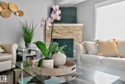 Recently Renovated! This 1739 sqft 2 bed, END UNIT TOWNHOUSE has 4 bathrooms! Located in South Terwillegar includes HEAT & WATER in the condo fee. Open Concept Main Floor boasts a Gourmet kitchen w/high-end appliances, Spacious Peninsula Kitchen, Cherry Wood Cabinets, and an abundance of drawers/cabinets throughout. Patio door access off kitchen to balcony (w/ gas-line). Air Conditioning. Large south facing windows for natural sunlight throughout. The Living Room and main floor has Stone Faced f/p, with newer luxury vinyl plank flooring, dining area & 9 ft ceilings and main floor laundry. Upstairs features large master w/16 ft loft ceiling, walk-in closet & 4-piece ensuite w/ soaker tub. Additional bedroom features a large walk in clodet & 4 piece bath completes the second floor. Recently renovated finished basement. ATTACHED SINGLE GARAGE, additional parking on outside pad - visitor parking steps from unit. Walking to spray park, public transport, shops & amenities. Quick access to Anthony Henday!