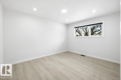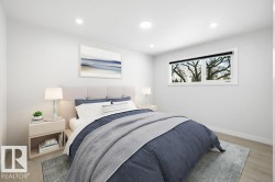 Welcome to Elmwood and this stunning, fully renovated 4 bed 2 bath open-concept bungalow. Designed for both comfort & style, this home is completely transformed & thoughtfully updated throughout; the home features: luxury vinyl plank flooring, new windows, modern baseboards & trim, upgraded interior doors, striking feature-wall fireplace, stylish lighting, fresh paint throughout, custom cabinetry, beautifully renovated bathrooms w/new vanities/sinks, elegant quartz countertops & sleek zebra blinds. Enter the show-stopping kitchen featuring two-toned matte cabinetry, SS appliances & impressive 76” quartz island ideal for gatherings & everyday living. 3 sizeable bedrooms & elegant 4pc bath. Fully finished basement w/ additional bedroom & gorgeous walk-through attached bathroom provides the perfect space for entertaining, relaxing, or hosting guests. Exterior upgrades complete the look w/freshly painted stucco, new siding, roof (2022), landscaping & refreshed garage. Just move in & enjoy!