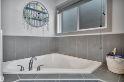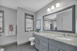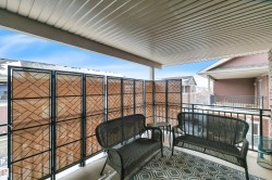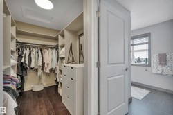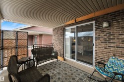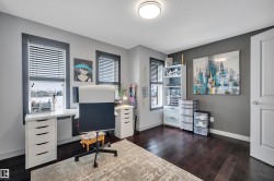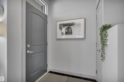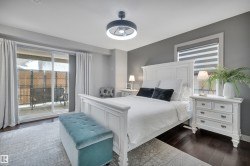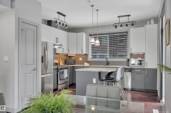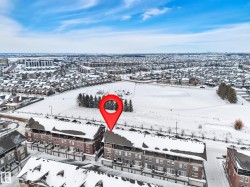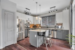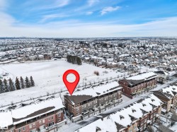 END UNIT townhome showcasing thoughtful design and exceptional natural light, with windows on the south, north, and west sides. Ideally positioned facing green space with a spray park just steps away. The open-concept layout features a gas fireplace that creates a warm, inviting separation between the living and dining areas. Engineered hardwood runs throughout. Enjoy three private outdoor spaces on three sides of the home, including a kitchen patio with gas BBQ hookup. The kitchen offers granite countertops, a gas stove, and pantry. Professionally installed blinds ($8,000 value) are included, saving you time and expense. Welcome guests through the front entrance into a bright main living space framed by mature trees. The double attached garage also features a private man door entrance offering more convenience. The impressive primary retreat features dual walk-in closets, a spacious ensuite, private patio, and room to create your dream bedroom oasis. This home truly stands apart — a must see!