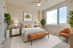 Unobstructed COTY VIEWS from this 2 bedroom SW CORNER UNIT in THE LEGACY. Conveniently located within walking distance of the LRT, MacEwan University, Ice District, shopping, restaurants, coffee shops and quick access to the river valley/walking trails, the Brewery District and the U of A. Lots of natural light with an west facing balcony with stunning views & gas BBQ hookup. Desirable layout with the bedrooms at the opposite ends of the living room. A bonus south facing kitchen window for the corner suite providing natural light to the kitchen & dining spaces. Hardwood floors in the main living space and carpet in the bedrooms. Upgraded with AIR CONDITONING. Stainless steel appliances, insuite laundry (stacking washer/dryer), good size storage room, underground parking #175. The building amenities include an exercise room, bike storage room, two great on site resident managers, and visitor parking.
