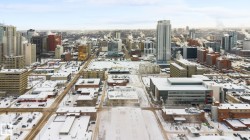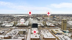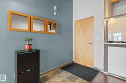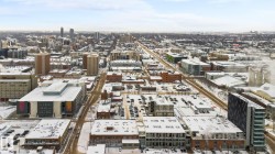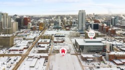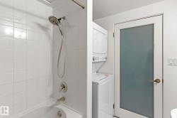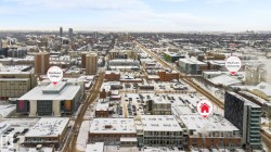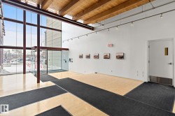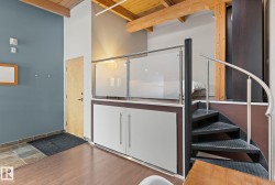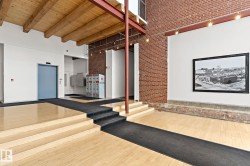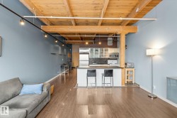 Historic Downtown Loft in the Iconic John Deere Warehouse! Experience the perfect mix of industrial charm and modern comfort with soaring 13' ceilings, original wood beams, a feature brick wall, and large west-facing window. A rare opening skylight with blackout blind fills the space with natural light and fresh air. The open-concept kitchen includes a large island for entertaining, while the raised bedroom platform offers smart under-bed storage. Enjoy laminate and ceramic tile flooring throughout. Prime Location – just 200m to MacEwan University & NorQuest College, and 600m to Rogers Place, grocery stores, and restaurants. Steps to the LRT and future 1.81-hectare Warehouse Park. Features include in-suite laundry, secure virtual keyless entry, underground bike storage, and on-site property maintenance. Move-in ready & Airbnb-friendly—a must see for investors, students, and professionals!