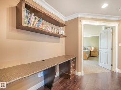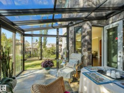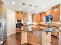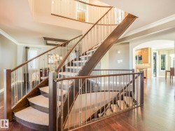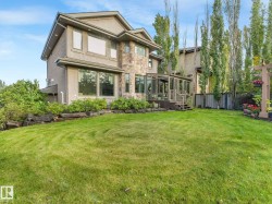Absolutely Stunning Custom-Built Birkholz 2-Storey in Prestigious Magrath Heights. Backing onto a gorgeous park, this timeless home has over 4,400 sq. ft. of luxury living, including a reverse walkout basement and a heated 4-season sunroom. A striking 18-ft foyer and sweeping curved staircase leads to elegant spaces with custom built-ins, detailed moldings, and warm contemporary finishes. The chef-inspired kitchen boasts floor-to-ceiling cabinetry and stainless steel. With hardwood floors, 5 bedrooms, 3 full + 2 half baths, and 2 dens/offices, this home adapts beautifully to any lifestyle. The primary suite features a spa-inspired ensuite with a massive tiled shower and Jacuzzi. Added perks include upper-level laundry, a spacious mudroom, central A/C & vacuum, a gas fireplace, and hardwood floors. Outside, enjoy a professionally landscaped, Rocky Mountain–inspired yard with two water features, a gazebo, and a sunny west backyard, oversized heated triple tandem garage. Great schools, trails, and the ravine