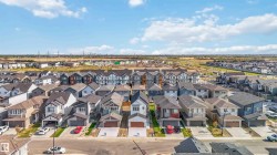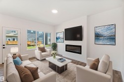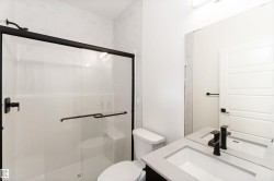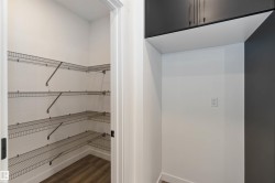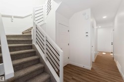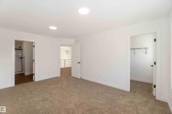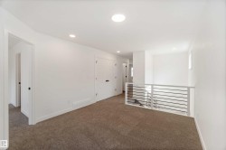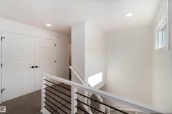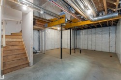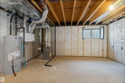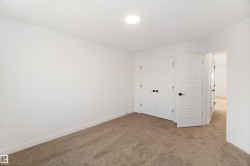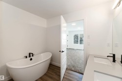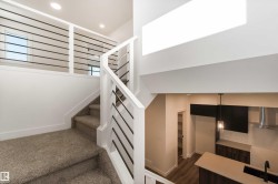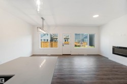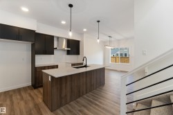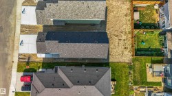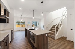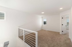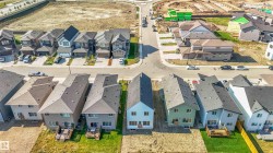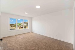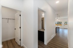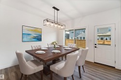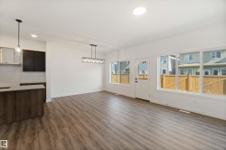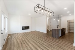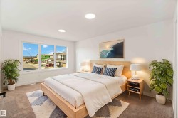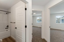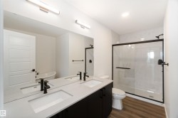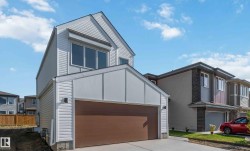 Welcome to The Affinity by Sterling Homes, a beautifully designed home combining elegance, functionality, and modern family living. The main floor features luxury vinyl plank flooring, 9’ ceilings, a double attached garage with added width and floor drain, and a separate side entrance. A welcoming foyer leads to a den and full 3-piece bath with walk-in shower. The open-concept kitchen, great room, and nook include an island with flush eating ledge, Silgranit undermount sink, built-in microwave, full-height tiled backsplash, chimney-style hood fan, soft-close cabinetry, and corner pantry. Large windows and patio door fill the great room with light. Upstairs offers a primary suite with walk-in closet and 5-piece ensuite with double sinks, walk-in shower, and free-standing tub, plus a bonus room, main bath, laundry, and two additional bedrooms. Black fixtures, upgraded railings, basement rough-in, and Sterling Signature Specification complete this home.