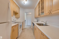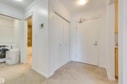 Welcome home to this RENOVATED spacious 707 sq.ft TOP FLOOR CONDO with TREELINE VIEWS in KLASS MANOR conveniently located close to transportation, quick access to Downtown, coffee shops, restaurants, the Anthony Henday, MacEwan, U of A & Concordia. Crown moulding throughout. The kitchen has plenty of maple cabinetry with slate flooring. The open layout living & dining room has maple hardwood flooring & access to the east facing balcony with great views. The main bathroom has a soaker tub with jets, quartz counters & slate tub surround. Good size primary bedroom. WASHER/DRYER COMBINATION. Shows very well!