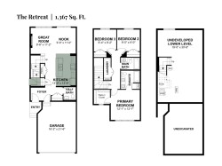 Welcome to the Retreat Duplex, a thoughtfully designed home blending style, comfort, and functionality. The main floor features 9’ ceilings, luxury vinyl plank flooring, and a double attached garage with floor drain. A welcoming foyer leads past a convenient half bath into the open-concept kitchen, great room, and dining area. The kitchen showcases quartz countertops, a central island with flush eating ledge and Silgranit undermount sink, pendant lighting, full-height tiled backsplash, chimney-style hood fan, built-in microwave, and upgraded soft-close cabinetry, plus a pantry tucked by the staircase. Large rear windows and a sliding patio door brighten the great room and nook, highlighted by an electric fireplace. Upstairs, the primary suite offers a walk-in closet and spa-like 4-piece ensuite with tub/shower and double sinks, while two additional bedrooms share a 3-piece bath. A laundry closet accommodates a stackable washer/dryer. Black fixtures and basement rough-in are included.