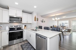 Modern comfort meets convenience in this stylish 3-storey townhouse. This is perfect for first-time buyers ready to own their first home! The entry-level features a bright foyer, extra storage, and access to your double-attached garage ideal for keeping vehicles warm and secure. Upstairs, the open-concept main floor offers a spacious living and dining area, a U-shaped kitchen with quartz countertops, a large walk-in pantry, and stainless steel appliances. Step onto your private deck to enjoy your morning coffee or unwind after work. A handy half bath completes this level. Upstairs, both bedrooms are primary suites, each with its own ensuite and ample closet space, plus laundry right where you need it. Thoughtful finishes include luxury vinyl plank, tile, and carpet throughout. With professional landscaping, low-maintenance living, and visitor parking right beside your home, this move-in-ready property is a smart and stylish choice for today’s buyers.