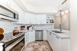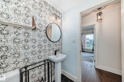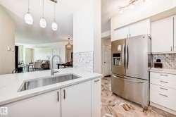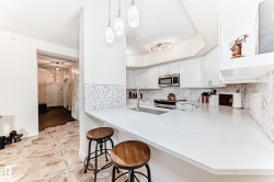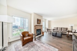 Urban living in sought after Westmount location. This beautifully renovated 2 bed, 2 bath condo offers refined comfort in a boutique building steps from 124 Street, Jasper Ave & the river valley. Inside, hardwood floors with transition tile, abundant storage & in-suite laundry set the tone. The renovated kitchen boasts granite counters, modern cabinetry, stainless steel appliances & stylish hex tile. Enjoy a bright open layout with a cozy gas fireplace, large windows, central A/C & access to a private covered patio. The spacious primary suite includes a walk-in shower and elegant ensuite. A second bedroom offers versatility for guests, a home office, or hobby space. The main bathroom has been fully updated with contemporary finishes. Additional upgrades include new windows, patio doors, deck surface, and iron railings. Complete with titled underground parking & gym, this is the ideal choice for urban living with style, comfort & a vibrant lifestyle in one of Edmonton’s most desirable neighbourhoods.