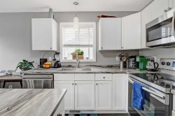 Discover this charming duplex in the family-friendly Lakeland neighborhood, just a short stroll from Maude Clifford School. The main floor offers a bright, open-concept living area that flows into a stylish kitchen featuring crisp white cabinetry, a functional island with bar seating, and a comfortable dining nook. Two generous bedrooms and a full 4-piece bathroom complete the upper level.Downstairs, you’ll find a fully developed basement with a spacious family room, a third bedroom, another 4-piece bathroom, and a convenient laundry/storage space. The home has seen plenty of updates over the years, including a refreshed kitchen (2017), updated flooring, lighting, appliances, bathroom renovations, low-flow toilets, newer hot water tank, and fencing — plus fresh paint throughout.The lower level’s separate entrance offers potential for a secondary suite or income opportunity. The yard is fully fenced and landscaped, with alley access and parking at the back. Whether you’re looking for a solid investment property or an affordable first home, this one is move-in ready!