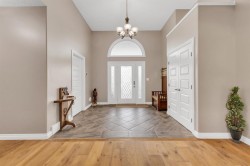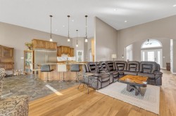 Nestled in one of the most desirable new subdivisions, this fully finished, executive-style bungalow offers nearly 6,000 sq. ft. of luxurious living space. Surrounded by custom-built homes featuring Hardie-board exteriors, composite decking, and covered front and back decks, this property perfectly blends elegance and craftsmanship. Step inside to be greeted by soaring 12-foot ceilings and an open, inviting layout. Just off the foyer, a versatile den provides the perfect space for a home office, music studio, or creative retreat. The open-concept kitchen, dining, and living areas are ideal for entertaining, with serene backyard views, a cozy corner gas fireplace and an included 85-inch wall-mounted TV. The chef-inspired kitchen is a showstopper, complete with a Frigidaire commercial-grade fridge and freezer, double wall ovens, gas cooktop, corner pantry, granite countertops, and a spacious island. The bright dining area flows seamlessly into the enclosed sunroom—perfect for plant lovers—and continues to a covered back deck with dedicated BBQ and entertaining spaces. Adjacent to the main living area is a private in-law suite, which can also serve as a second primary bedroom. This impressive suite features its own sitting room with a second corner fireplace, a spacious bedroom, a 4-piece bath and direct access to a private enclosed deck—making it ideal for guests or multi-generational living. Down the hall, you’ll find a convenient laundry area, ample storage, a 2-piece powder room, and interior access to the attached 3-car garage, which includes a wheelchair-accessible lift for added convenience and accessibility. The main primary suite offers a tranquil retreat, complete with a large walk-in closet and a luxurious 4-piece ensuite featuring a separate tub and shower. The main floor is finished with durable hardwood flooring throughout. The fully developed basement offers exceptional space for multi-generational families, featuring a massive family room and two private wings. One side includes an exercise room, two oversized bedrooms, and a full bath, while the other features two additional oversized bedrooms and another full bath. The lower level also includes a mechanical/storage area, second laundry space, exercise zone and a convenient kitchenette—making it perfect for extended family or independent living arrangements. Outside, enjoy a fully fenced yard, low-maintenance landscaping, and a handy storage shed for tools and outdoor gear. Brimming with thoughtful details, luxury finishes, and designed with multi-generational living in mind, this home is truly move-in ready—just unpack and enjoy the Highlands lifestyle! Call today to schedule your private viewing!