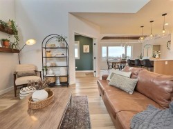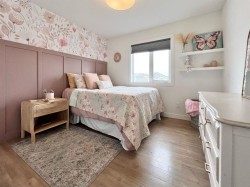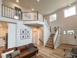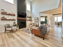 Welcome to Whispering Ridge… where luxury meets lifestyle on the pond.This stunning five-bedroom home with a dedicated office, gym, and fully equipped theatre room was designed to impress at every turn. Backing directly onto the water, the views create a peaceful backdrop you’ll enjoy year-round.Step inside to a soaring entryway that immediately sets the tone, anchored by a dramatic floor-to-ceiling fireplace. Engineered hardwood flooring flows throughout the main living spaces, complemented by quartz countertops, a gas range, and a beautifully moody butler’s pantry that adds both function and flair. Built-in speakers carry your favorite playlists seamlessly throughout the home.The primary suite is big, beautiful, and thoughtfully designed… complete with a charming Juliet balcony overlooking the pond. The spa-inspired ensuite features floor-to-ceiling tile, dual showerheads, a bench, double vanity, and a dedicated makeup station. Two additional bedrooms are generously sized, and convenient main-floor laundry adds everyday ease.Downstairs, the theatre room is ready for movie night with all equipment included, plus a stylish wet bar that makes entertaining effortless.Outside, the lifestyle continues. Enjoy a private putting green, a powered shed, RV parking, and a heated garage. With central air conditioning included, comfort is covered in every season.This is more than a home… it’s a full experience in one of Whispering Ridge’s most desirable pond-side locations.