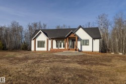 Discover a new 1734 sq ft custom bungalow on 4.55 private acres, blending luxury craftsmanship with serene natural living. Fantastic curb appeal with gorgeous fir beams and board/batten LP Smart Siding. Inside, the open layout with 3 main floor bedrooms and 2.5 baths offers spacious comfort while the large basement with in-floor heating offers endless potential. LUX triple-pane windows, 8' exterior doors, custom trim/tile work, quartz counters and ceiling height backsplash are just a few of the quality finishings. A 36" gas fireplace anchors the living area with warmth and ambiance. Primary features walk-in + 3pc ensuite with heated floor (incl shower)! Step outside to a raised deck overlooking untouched nature, ideal for relaxing, hosting, or simply watching the abundant wildlife. Tucked among the trees, a cute bonus office studio could create the perfect guest suite, studio, or retreat! A stunning property that delivers craftsmanship, comfort, and the peaceful acreage lifestyle you’ve been dreaming of.