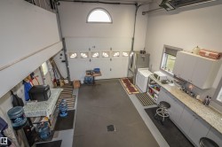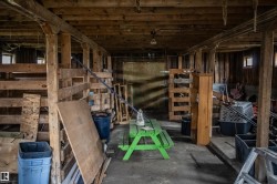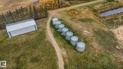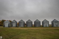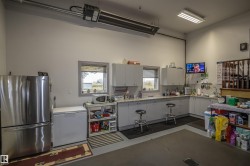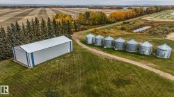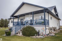 This elegant rural property offers exceptional country living on a quiet road, with pride of ownership throughout. The open-concept main floor includes a spacious kitchen with granite countertops, dining area, and living room with a wood-burning fireplace. The primary bedroom features a walk-in closet, plus there is a second bedroom and main floor laundry. The finished basement offers a large family room, bar area, and two additional bedrooms. Outbuildings include a single attached garage, triple detached heated workshop, cold storage shop, barn with new metal roof, seven grain bins, and chicken coops. A second residence provides options for multi-generational living or a small business.