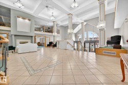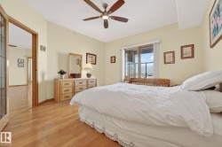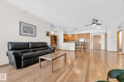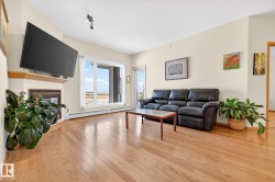 TOP FLOOR. END UNIT. 2 Bed + 2 Bath. This beautifully maintained home shows 10/10 and offers true maintenance-free living in one of the most desirable 55+ buildings around. With new 72" tall glass railings, 9’ ceilings, hardwood and ceramic tile (no carpet), AC, and huge windows bringing in natural light, this is the quiet, elevated lifestyle you’ve been waiting for. The open kitchen features a newer microwave & dishwasher and the bright living area leads to a covered balcony with gas BBQ hookup. Bedrooms sit on opposite sides for privacy, including a generous primary with ensuite. Large well designed laundry room plus enjoy exceptional amenities: indoor pool//hot tub, gym, 2 games rooms, media room, craft & sewing rooms, woodworking shop, library, party room, and guest suites on every floor. A heated underground parkade offers a private enclosed storage room and car wash bay The perfect blend of comfort, community, and carefree living.