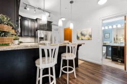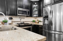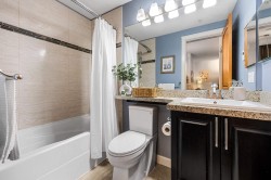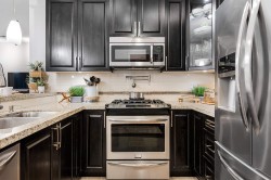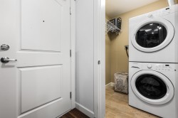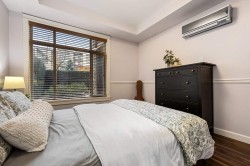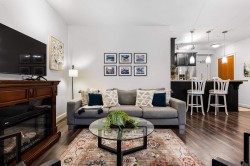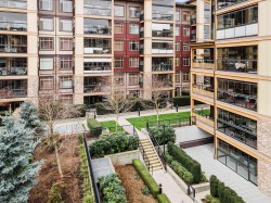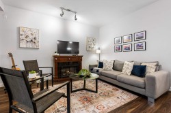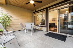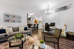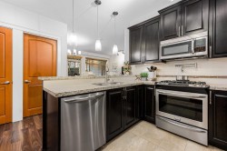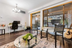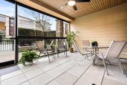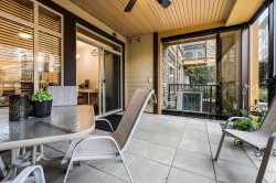 RARE ground-floor condo at sought-after La Galleria! Spacious 1Bed 1Bath has 863 sqft w/ a stunning glass solarium w/ retractable panels, NG BBQ hookup, opening to a rare private patio area. Enjoy 9’ ceilings, large windows, fireplace, A/C HEAT PUMP, and a gourmet kitchen with GAS RANGE, pot filler, GRANITE COUNTERS, and high-end fixtures. The large primary fits a king bed and features closet organizers, while the spa-like bath offers heated floors. Includes IN-SUITE LAUNDRY ROOM, secure 8.5x10' CONCRETE STORAGE W/ POWER, and 2 UNDERGROUND EV-READY PARKING STALLS. Built with superior sound insulation in a beautiful West Coast building with 55+ cameras, GYM, REC ROOM & a landscaped courtyard w/ seating areas. Pet & family friendly, all within walking distance to transit, shops, and dinning.