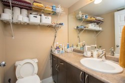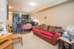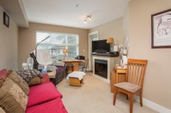 Welcome to Viva on Park, centrally located near downtown Abbotsford. This 1 bedroom plus flex den is tucked away on the quiet side of the building and features a private balcony. The open-concept layout offers a spacious kitchen with a convenient breakfast bar and dining area. The living room includes an electric fireplace, while the generously sized bedroom boasts large windows that fill the space with natural light. This unit also includes in-suite laundry, one parking stall, and a storage locker. Enjoy exceptional walk-ability to local shops, breweries, recreation facilities, skating rink. pool, fitness centre, and scenic hiking/ biking trails. Just minutes from the University of the Fraser Valley and access to the Mission Hwy.