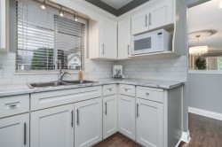 NO STAIRS in this 1200sf GROUND LEVEL END UNIT at Forest Edge in Central Abby! 2 bedrooms, 2 bathrooms, updated kitchen, some new windows, and freshly painted walls and ceilings. This friendly 55+ community has a proactive strata that has recently replaced fencing, retaining walls, and roof. Enjoy the convenience of two parking spots--one covered and in front of the home. Nice low strata fees (around $300/month). Pets allowed: one cat or one dog to a max height of 14" at shoulders. Perfect home for downsizers looking for a spacious, low maintenance home.