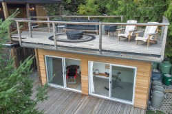 Located at the end of a quiet road, you will instantly feel one w/nature. This unique property offers 3 bedrooms upstairs in main living area & 2 suites downstairs that can connect to main house offering potential for investment suites. The house features beautiful details w/expansive indoor and outdoor areas with stunning south views of Killarney Lake throughout. Walk down some steps to arrive at the forest spa w/two outdoor tubs and Scandinavian style sauna. Keep going down steps to arrive at the 791sqft 1-bedroom cabin w/full kitchen, fireplace, bathroom, outdoor patio & veggie garden ready to harvest for meal time. Head for a swim in the lake via your private trail leading directly to Killarney Loop. This home must be seen to capture the quality of detail throughout.