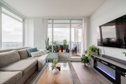 Welcome to Fulton House by Polygon in desirable Brentwood! This bright SE corner 2-bed, 2-bath home has a functional open layout with a contemporary kitchen, quartz counters, gas cooktop, built-in fridge, and large island flowing into the living/dining areas. Floor-to-ceiling windows and 9’ ceilings create an airy feel with sweeping views. Both bedrooms are generously sized with custom closets, while the primary adds an ensuite and private balcony. The second balcony extends from the living room. Full-size side-by-side laundry adds convenience. Resort-style amenities at the 28,000 sq. ft. Fulton Club: pool, hot tub, sauna, gym, yoga studio, lounge, guest suite & more. Steps to Brentwood Mall & SkyTrain. BONUS – 2 storage lockers and parking spot right near the elevator.