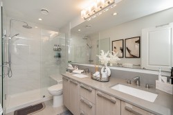 A bright corner-style home in Byrnepark w/panoramic windows & a treed, private outlook. A large kitchen island anchors the modern kitchen w/full-height cabinetry & stainless appliances. The living & dining area flows out to a covered balcony facing greenery, an easy spot for morning routines. The primary bed includes a redesigned closet, custom accent wall, built-in dresser, & a makeup area w/mirror & shelving, plus a spa-like ensuite w/a double vanity & clean stone finishes. The 2nd bedrm sits on the opposite side of the home for added separation. A tucked-away entry & laundry keep everyday clutter out of sight. Soft drapery, smart heat controls, window nets, & a balcony door net add comfort.