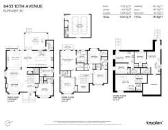Welcome to 8433 10th Avenue! High side of the street, parking out front is allowed on this part of 10th Avenue. Just like new, TOTAL of 7 BDRMS, 8 BATHS over 4000 sqft of finished home. Top floor has 4 BDRMS , 3 FULL BATHS & laundry. Main floor has separate Living & Dining RM. Decorative wall separating family rm & kitchen. Grand kitchen with off white cabinets, built-in-appliances, huge Island & spice kitchen with gas stove, fridge & dishwasher. Beautuifully designed family rm entertainment wall. Full BDRM w/BATH on main floor. Basement has media rm. 2 suites, both are 1 BDRM each with laundry. Radiant heated floors. CCTV, A/C, covered deck, 2 car garage w/2 piece bath, electric gate off the lane. Central location, easy access to Hwy#1, SFU, both levels of schools...