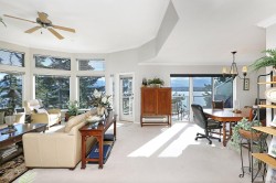 Waterfront Penthouse in Comox! Fantastic location in a serene, park-like setting. This very private condo offers an 'eagle eye' ocean view across the water to the lights of the city, the Beaufort Mountains and the Comox Glacier. Enjoy the magnificent west view from the deck, the Great room & the kitchen. Watch the eagles soar and perch in the nearby trees. Stroll to the beach along the path for a picnic, beachcombing or a kayak in the bay. Unique open plan of 1,655 sf, 2 BD/ 2 BA, with 10' ceilings in the Great room, ceiling fan, surrounded by transom & full height windows, gas fireplace with digital thermostat, upgraded features include Quartz countertops, hot water on demand, s/s appliances, Restoration Hardware lighting, secure front screen door, built-in vacuum, power skylight opener. Single garage w/ clever storage only 10 steps from front door. Secure gated complex, 1 dog or 1 cat. Short walk to Comox for all amenities, restaurants, shops & the Marina. Poly-B plumbing removed!