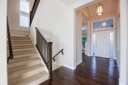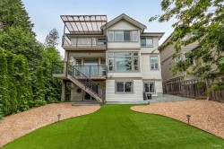 Nestled in Burke Mountain's serene landscape, this exquisite three-level Foxridge home combines luxury with functionality. Situated on a spacious corner lot adjacent to hiking trails, it boasts a thoughtful layout with upgraded hardwood floors, a gourmet kitchen featuring premium stainless steel appliances, and a cozy gas fireplace in the living area. South-facing terraces on multiple levels offer stunning views of Mount Baker and Fraser Valley. The upper level includes a master bedroom with an ensuite bathroom and three additional bedrooms. The walkout basement features a versatile space with a bedroom, full bath, and a den. Ideal for families, it is within walking distance to schools, new school catchment, daycare, and just minutes from Coquitlam Centre, T&T, Douglas College,and SkyTrain