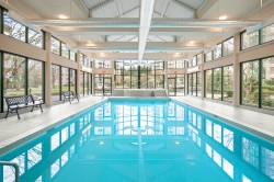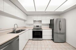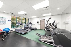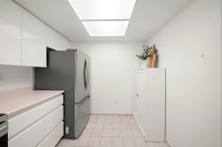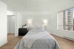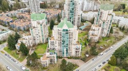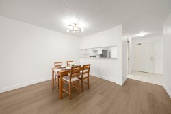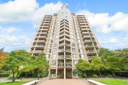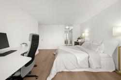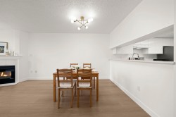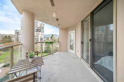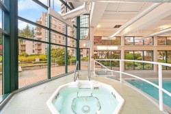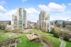 Welcome to this bright 1,089 sqft unit with floor-to-ceiling windows overlooking a peaceful courtyard with garden views. This spacious open-concept 2 bed, 2 bath home features generous living and dining areas, updated waterproof vinyl flooring, fresh paint, stainless steel appliances, a cozy gas fireplace, and ample closet space. The roomy primary bedroom includes a full ensuite w/ ample space for comfort & convenience. Each room opens to a covered balcony, ideal for year-round outdoor living. Families will love the location, with Glen Elementary and Glen Park just steps across the street. Originally built by Bosa, the building offers resort-style amenities including an indoor pool, hot tub, sauna, gym, racquet court, and clubhouse. 1 parking stall and 1 storage locker included.