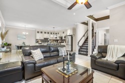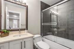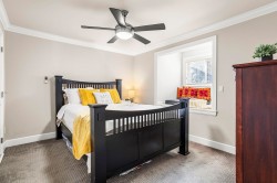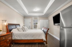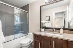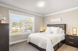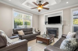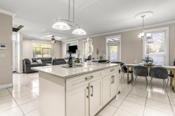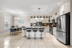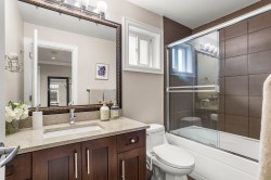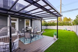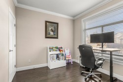 Rare opportunity offering corner duplex in prime location! Enter into a spacious, bright, open layout featuring a spacious living and dining area with a gas fireplace. The main floor includes a bedroom with a full ensuite with separate entrance, ideal for extended family or guests, plus a bonus office/nook and a powder room. The chef's kitchen has s/s appliances, a large island, soft-close cabinetry, and ample storage. Upstairs offers three generous bedrooms, including a spacious primary suite with a full ensuite and two closets. A full bath and convenient side/side laundry complete the UL. Enjoy a renovated, low-maint backyard with turf and a patio perfect for relaxing or entertaining. Radiant heating and four parking spaces. Close to schools, shopping, N. Delta Rec Centre & major routes.