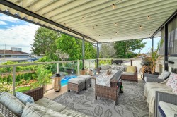Luxuriously updated 6 bedroom, 4 bathroom; 3,633 square foot Pebble Hill home on a beautifully landscaped 10,796 sq ft lot with a "showstopping" outdoor pool - perfect for summer relaxation and family gatherings. Enjoy breathtaking Mount Baker & ocean sunrise views from the 22'2 X 11'10 rooftop deck. Features include 15' vaulted ceilings, custom millwork, expansive updated windows, laminate floors, and renovated kitchen & baths. Lower level ideal for multi-generational living. Walk to Pebble Hill Traditional Elementary & Diefenbaker Park. 2 car garage: 25' X 19'7 and plenty of parking including RV parking!