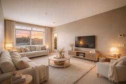 The open-concept living space flows onto a private balcony, perfect for morning coffee or evening wind-down .