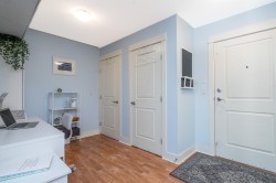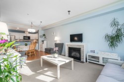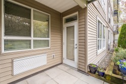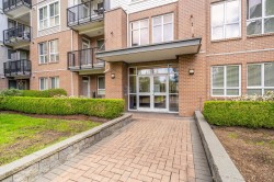 Welcome to The Sonnet! A well-maintained gated building with very low strata fees. This ground-floor, south-facing 1-bedroom + flex space unit offers abundant natural light with tall windows, 9 ft ceilings, and crown moulding. The bright, open-concept kitchen features upgraded appliances and a new sink. The bathroom was fully renovated in 2021 with a new vanity, soaker tub and in-floor heating. The spacious living area opens to a private patio, perfect for entertaining. Includes built-in A/C, only a couple of years old. Central, bike-friendly location within walking distance of the future SkyTrain station. Large storage locker on the same floor for convenient access. Amenities include fitness and recreation rooms, secure bike storage, and ample visitor parking. Book your showing today!