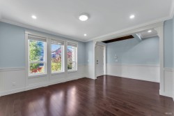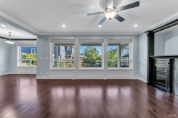 Luxurious home in Yorkson South! Featuring a gourmet kitchen with granite counters, large island with built-in drawers, custom maple cabinets, S/S appliances & gas stove. Main floor offers a spacious office/living space with wainscoting, plus a bright family room with gas fireplace, custom built-ins & engineered hardwood floors. Upstairs includes a primary suite with walk-in closet & organizers, ensuite with jacuzzi tub, granite counters, maple cabinets, separate showers & mountain views. Radiant heat, designer lighting & crown mouldings throughout the top two floors. Basement includes media room & 2-bed legal suite with new laminate flooring. Close to Lynn Fripps Elementary, parks & shopping.