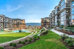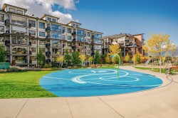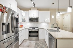 Yorkson Park Living at its best! This is a South Facing unit - 3 spacious bedrooms with a sound-dampening acoustic package, 2 full bathrooms with heated floors, and year-round comfort with air conditioning and an energy-efficient heat pump. Enjoy a 200+ sq ft enclosed solarium with a gas BBQ hookup, plus 2 underground parking stalls, and a large private roll-up storage locker with a capable EV charger outlet, enough space for paddle boards and an EV Bike. Throughout: laminate floors and custom wood closets. A Gourmet Kitchen with stainless steel appliances: 5-burner gas cooktop, double oven, quartz counters & walk-in pantry/storage. Enjoy the amenities such as a Gym, walking paths, a recreation room, and a playground. Steps to the Carvolth Bus Loop and easy access to Hwy 1.