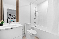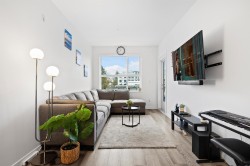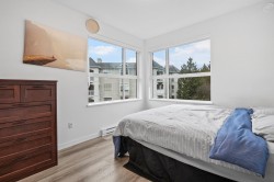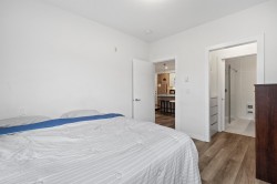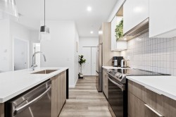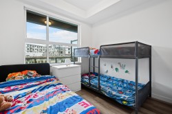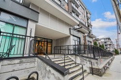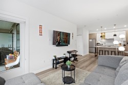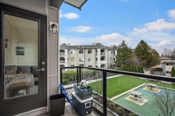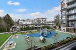This beautiful designed 2-bedroom + den, 2-bath corner checks all the boxes, featuring 2 parking stall, EV plug, and A/C rough-in. The smart layout places bedrooms on opposite sides for added privacy, while the spacious den is perfect for a home office. Enjoy a modern kitchen with two-tone cabinetry, sleek island, and stainless steel appliances. The open living area leads to a large balcony overlooking the playground. Steps to Langley City Centre and walking distance to the future SkyTrain station - offering convenience and growth potential.