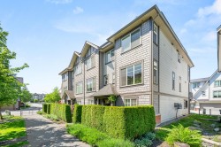 EVERLY GREEN – The best unit in the complex! This bright, end-unit townhome boasts the highest rooftop with stunning mountain and forest views. One of only three units with 3 parking spots—garage, carport & driveway. The private rooftop patio is a true oasis: sunny all day and perfect for sunbathing, dining, BBQs (gas hookup), relaxing by the fire, or adding a canopy for year-round use. Enjoy a second patio off the kitchen and a sunny front yard with new grass. Surrounded on 3 sides by protected greenbelt, with a playground at your doorstep and Yorkson Park just steps away. Walk to schools, close to HWY 1 & Carvolth. Bonus den, epoxy garage floors, gas range—this one has it all!