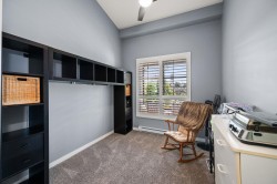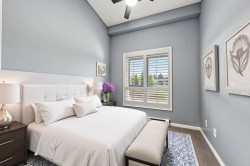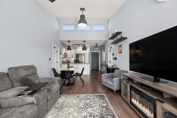 TOP FLOOR, VAULTED CEILINGS! Beautifully bright and sunny south exposure! Downsizer alert! This is the unit that you've been waiting for! Downsize in safety and comfort in this 2BDRM 2 BATH condo, with one occupant needing to be 55+ in age. Up to 13'ft vaulted ceilings! White kitchen cabinetry, S/S appliance package incl gas stove, granite counters. Heated ensuite tile floor in the master bath. 2nd Bdrm with cheater ensuite/main bath. Updated laminate floors and newer carpet in bdrm’s. California shutters. Updated paint and lighting throughout. BONUS storage locker on the same floor and 2 side by side parking stalls. Secure bike storage, fitness room and clubhouse included!NEW Heatpump offering A/C!