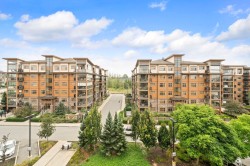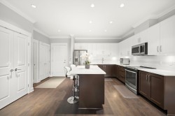 Exquisite Top-Floor Residence at The Kensington, Willoughby Town Centre. This 1,240 sq.ft. south-facing home offers a sophisticated open layout with 2 bedrooms + den, soaring 9-ft ceilings, and two private South facing sundecks. Elegant details include crown mouldings, a feature fireplace, and a refined neutral palette. The gourmet kitchen showcases a large island, quartz counters, and premium stainless steel appliances. Added conveniences: in-suite laundry with storage, two prime parking stalls (fits full-size truck), and a storage locker. Perfectly located steps from fine dining, boutique shops, transit, and Hwy 1 access. A rare opportunity for elevated living.
