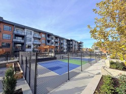 Welcome to Kensington Gate by Quadra Homes Experience exceptional quality and craftsmanship from one of the most trusted condo builders in the region. This spacious 2-bedroom, 2-bathroom unit offers modern luxury and comfort in the heart of a highly sought-after neighborhood. The gourmet kitchen is equipped with high-end stainless steel appliances, including a 5-burner gas cooktop, convection oven, quartz countertops, and classic white shaker cabinets. Both bathrooms feature heated tile floors for added comfort. Enjoy 9-foot ceilings, oversized windows, custom blinds, and built-in air conditioning throughout the unit. Step out onto the sundeck, complete with a gas hookup for BBQ—perfect for entertaining. Additional features include secure underground parking with EV charging capability,