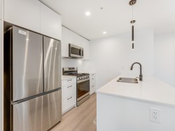 Welcome to the most popular location within the vibrant Latimer Village in Willoughby! This rarely available home with 9' height ceiling has a huge size (over 400 sf) deck for outside dining, viewing and entertaining. It boasts an open-concept floor plan, showcasing a contemporary kitchen equipped with full-sized stainless steel appliances, including a gas cooktop, and a generously sized island. One parking one storage locker. Central location: close to Highway 1 and Costco, Walmart, Willowbrook Mall and Willoughby Town Centre.
