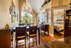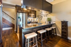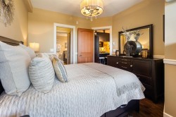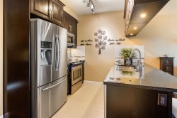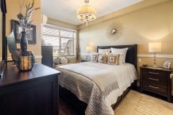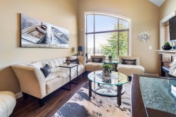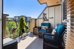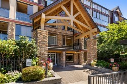 WALNUT RIDGE AT YORKSON CREEK - RARE PENTHOUSE LOFT UNIT WITH VAULTED CEILINGS AND TWO PRIMARY BEDROOMS. This immaculate unit stands out with Quadra quality interiors, featuring acoustic wood-grained plank laminate, electric fireplace, solid-core fir doors & closets with built-in shelves. Kitchen w/ ample cupboard space, granite tops, under-mount sink and S/S appliances. Heated tile bathroom floors, granite vanity tops and fog-free mirrors. Enjoy your east facing balcony and A/C is included. 2 primary suites to chose from, one on the main floor or one upstairs for privacy. Separate den plus laundry with room, lots of storage! No neighbours above you with this top floor unit. Amazing location - walk to schools, parks & shopping. 2 parking stalls right next to each other. Don't miss it!