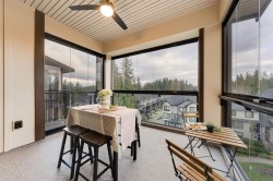 East facing PENTHOUSE offering exceptional design and premium features throughout. This Jr. 3bed + 2bath home offers a bright square glass solarium with a gas connection perfect for year round BBQs. The interior has been thoughtfully enhanced with a custom feature wall design and a complete repaint elevating the home’s modern aesthetic. Gourmet appliances include a 5 burner gas cooktop, double oven, quartz countertops, heated bathroom tile floors and energy efficient heat pump(A/C & heat) ensure comfort and convenience in every season. Comes with 2 SIDE BY SIDE underground parking stalls and 2 private storage garage right behind the parking equipped with an electrical outlet suitable for EV charging! 1 block from Carvolth Exchange and easy access to Hwy1 | OPEN HOUSE Dec 21(Sun) 2-4PM