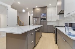 3-level 1/2 duplex in Willoughby Heights with modern finishes and a functional layout. Main floor offers an open-concept great room, dining area, and designer kitchen with stainless steel appliances, plus a den and powder room. Upstairs features a spacious primary bedroom with ensuite, two additional bedrooms, full bath, and laundry. Basement includes a large rec room, bedroom, and storage. Back lane access with detached garage, fenced yard, and 2-5-10 home warranty. Close to schools,