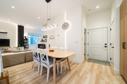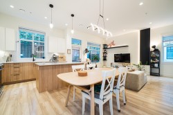 This well-designed corner unit townhome at NEWBURY offers two levels of living space with a layout that truly feels like a single-family home. The main floor features 10-foot ceilings, while the second level offers 9-foot ceilings throughout, creating a bright and open atmosphere. All bedrooms are generously sized with highly functional layouts. Enjoy excellent privacy, with the front of the home facing a landscaped garden and community mailbox area, and the rear backing onto a large detached single-family home set well away. A walk-out main floor patio extends the living space outdoors, while the spacious upper-level loft provides flexibility for a home office or additional living area. Ample storage throughout and a side-by-side double garage complete this comfortable and modern home.