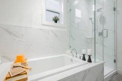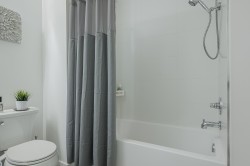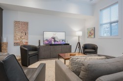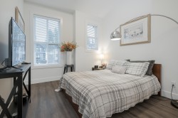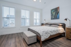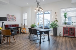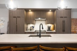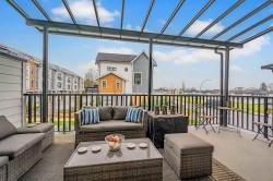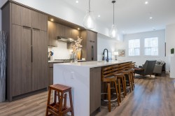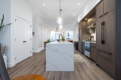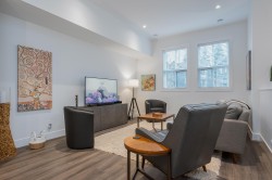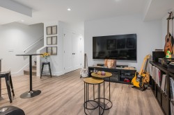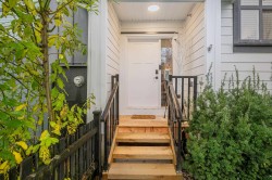 Exceptionally built END-UNIT ROWHOME by North Arc Properties with NO STRATA FEES. This spacious & meticulously maintained home shows like new and offers extensive upgrades throughout. Enjoy A/C, a chef-inspired kitchen w/ wine fridge and Fisher & Paykel appliances complemented by high-end finishes throughout. The professionally finished basement is ideal for guests or entertaining, showcasing a custom bar w/sink, wine storage, cabinetry & bar fridge, plus a developer-installed soundproofed bedroom. Well-sized bedrooms with potential to add 5th bedroom upstairs. Enjoy year-round outdoor living on the covered deck with gas BBQ hookup and custom awning. Rare 4-vehicle parking with double garage (epoxy floors) plus parking pad. A standout home offering privacy, space and luxury without strata.