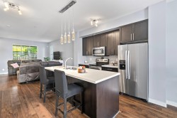 END UNIT | 3 Bed + Rec | 1,600+ Sq Ft | Upgrades Throughout Spacious 3-bedroom end-unit townhome with over 1,600 sq ft of living space in a prime, family-friendly location! Features include double side-by-side garage + driveway parking, new carpet throughout, lifetime warranty vinyl plank flooring, upgraded lighting, and custom detailed entryways. Bright open-concept main floor with large kitchen island, electric fireplace, and full-sized dining area. Oversized rec room below—ideal for office, gym, or playroom. Two covered outdoor spaces: private deck + patio and a large front yard. Steps to Kanaka Creek Elementary, parks, trails, and easy access to transit, West Coast Express & highways.