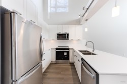 Edge 2, substantially rebuilt 2 bedroom penthouse with loft (1 bedroom on main and another on the loft), 2 full baths with laminate flooring throughout living, dinning and kitchen, and quartz counter tops. SELDOM AVAILABLE 18 ft. ceiling height in living room, dinning room and kitchen. Suite is flooded with day light through extra high windows. Panoramic mountain view and walking distance to elementary school, park, restaurants and shopping. Property comes with one parking and one storage locker.